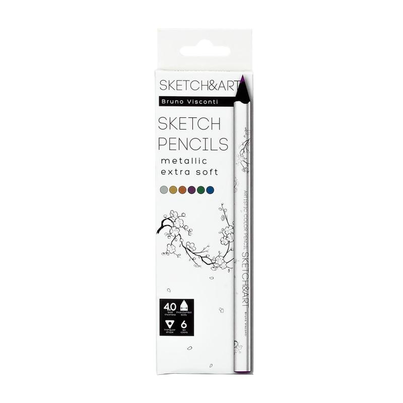 Карандаши цветные художественные классические Sketch&Art 6 карандашей 6 цветов трёхгранные (утолщённые, металлические)<br> <br> Набор цветных художественных карандашей Sketch&Art состоит из 6 трёхгранных (утолщённых) карандашей металлического цвета. Корпус карандашей изготовлен из чёрного термообработанного дерева, имеет защитный лак на водной основе, окрашенный диппинг и авторский принт. Диаметр корпуса составляет 10 мм, длина — 175 мм.<br> <br> Грифель диаметром 4 мм не крошится и не ломается благодаря дополнительному проклеиванию дисперсионным клеем. Карандаши упакованы в брендированную картонную коробку с покрытием Soft Touch. Размер упаковки составляет 58×11×201 мм.