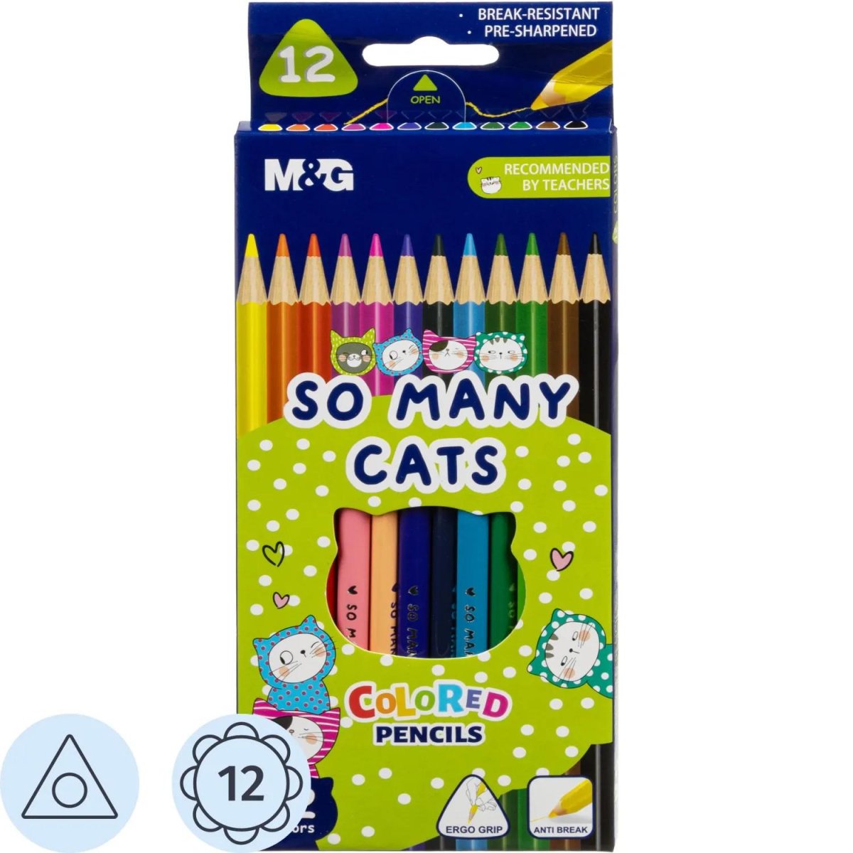 Карандаши цветные M&G So Many Cats 12 карандашей 12 цветов трёхгранные<br> <br> Карандаши цветные So Many Cats предназначены для рисования, письма и раскрашивания на бумаге. Применяются детьми, студентами и взрослыми для творчества. Рекомендованный возраст от 3 лет. Набор содержит 12 цветов. Материал корпуса — древесина. Корпус трёхгранный, диаметр: 7 мм. Длина корпуса: 175 мм.<br> <br> Диаметр грифеля: 3 мм. Грифель разноцветный. Карандаши заточены. Форма корпуса способствует правильному захвату пальцами. Упакованы в картонную коробку с европодвесом. Размер упаковки: 88×8x180 мм.