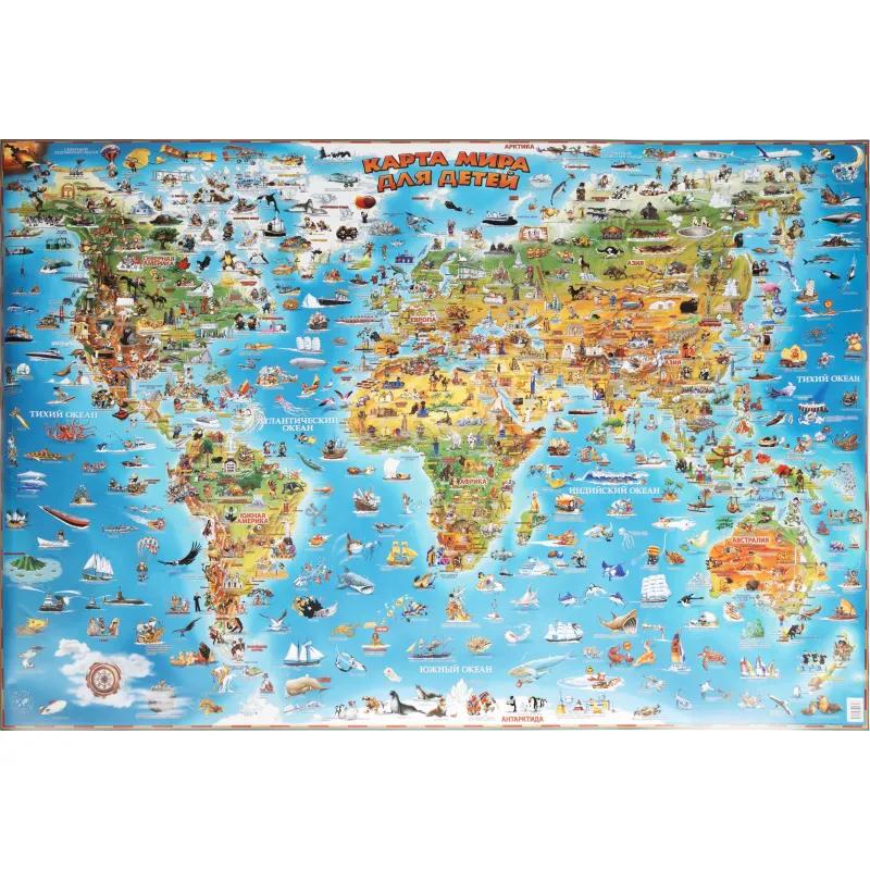 Карта мира физическая настенная 137×97 см<br><br>Настенная карта мира для детей. <br>Формат — 137×97 см.<br>Карта отпечатана на мелованной бумаге и покрыта тонкой антибликовой пленкой со стороны изображения. <br>Карта содержит множество потрясающих иллюстраций, которые познакомят ребенка с флорой и фауной всего мира, достопримечательностями разных стран, местными обычаями, традициями и играми. Изучая карту, ребенок узнает, где живут ламы, в каких странах танцуют самбу и увлекаются бирлингом. Карта познакомит детей с известными путешественниками, с географическими открытиями, историей авиации и мореходства.