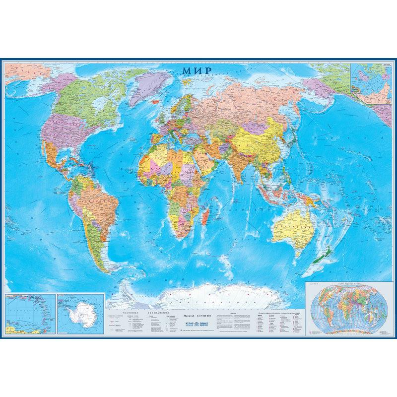 Карта мира политическая 1:17 000 000 настенная 202×143 см с ламинацией<br><br>Настенная политическая карта Мира. <br>Формат 2020×1430 мм. <br>Мелованная бумага с матовой ламинацией. <br>Цветом показаны все страны Мира, подписаны названия столиц. Цветным фоном показан рельеф суши и морского дна. <br>Год издания 2023.