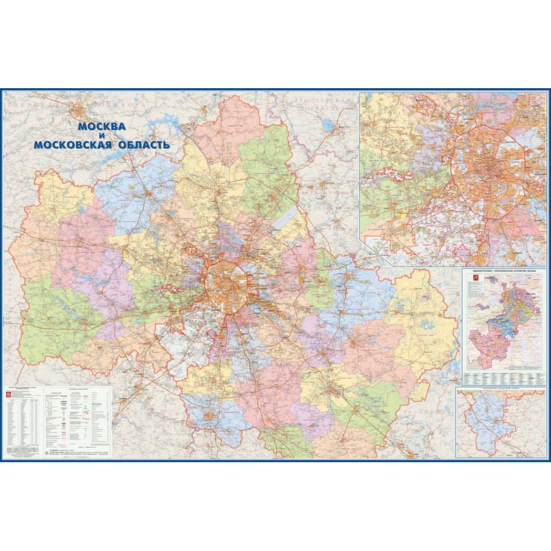 Карта Москвы и Московской области территориально-административная 1:170 000 настенная 233×158 см с ламинацией<br><br>Бумага с ламинированием. <br>Формат 2330×1580 мм. <br>Показаны и подписаны все районы Московской области, их центры, а также основные населенные пункты, автомобильные и железные дороги. На врезке дана более подробная карта Москвы и окрестностей, схема административного деления Москвы и список районов Московской области. <br>Масштаб 1:170 000. <br>Год издания 2022.
