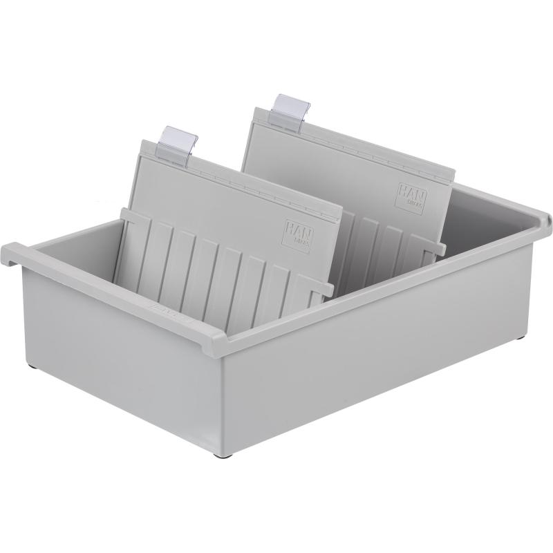 Открытая горизонтальная картотека формата А5 для хранения 1300 картонных карточек.<br>Изготовлена из жесткого пластика серого цвета.<br>В комплекте 2 пластиковых разделителя серого цвета и 2 прозрачных индексных окна(арт.63669).<br>Размеры картотеки: 347×228×96 мм<br>Размер карточек: 210×148 мм.<br>Возможна установка до 26 разделителей (арт. 57561).