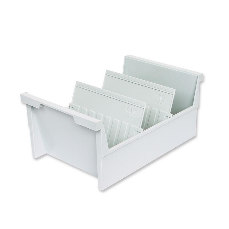 Открытая горизонтальная картотека Han формата А5 изготовлена из пластика светло-серого цвета, размеры — 226×350×156 мм. Предназначена для удобного хранения и систематизации карточек и документов. Вмещает до 1000 картонных карточек (в комплект не входят). Картотека поставляется с двумя пластиковыми разделителями. Всего можно установить до 14 разделителей (приобретаются отдельно).