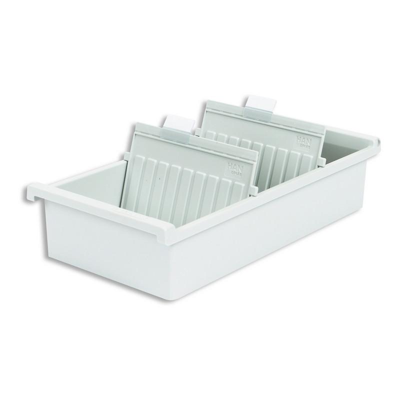 Открытая горизонтальная картотека формата А6 для хранения 1300 картонных карточек.<br>Изготовлена из жесткого пластика серого цвета.<br>В комплекте 2 пластиковых разделителя серого цвета и 2 прозрачных индексных окна (арт. 63669).<br>Размеры картотеки: 347×171×76 мм<br>Размер карточек: 148×105 мм.<br>Возможна установка до 26 разделителей (арт. 57562).