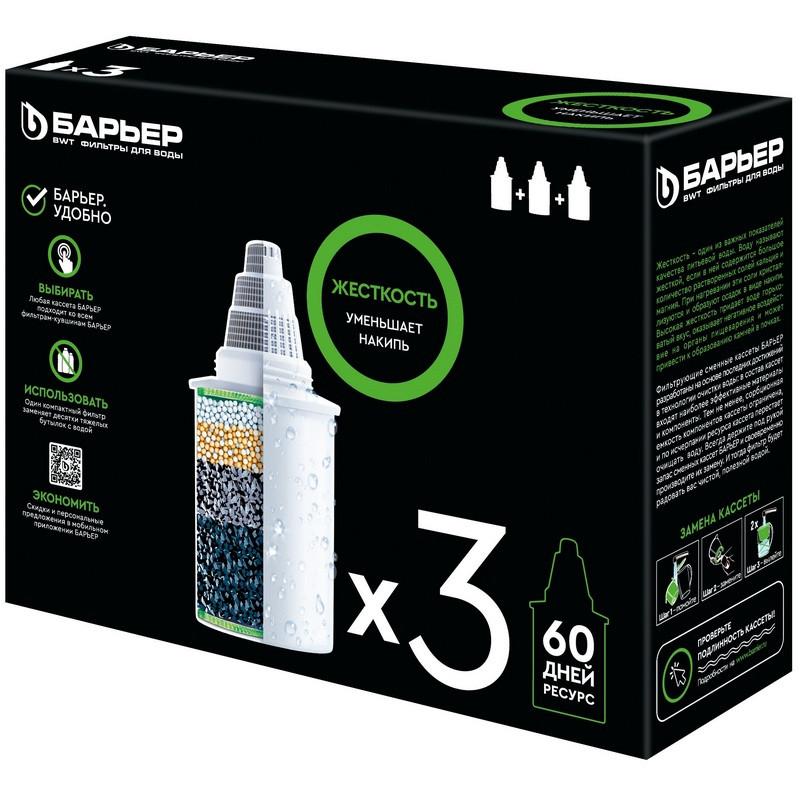 Картридж для воды Барьер Жесткость К273Р00 защищает от накипи 3 штуки в упаковке. <br>Специальная очистка жесткой воды, позволяет забыть о накипи в чайнике, удаляет хлор и его соединения, тяжелые металлы и другие вредные примеси. <br>Резьбовое соединение надежно фиксирует кассету и не дает попасть нефильтрованной воде в чистую. <br>Ресурс зависит от качества исходной воды, но составляет не более 350 литров. <br>В состав кассеты входит: <br>— смесь ионообменных смол — снижает общую жесткость; <br>— кокосовый активированный уголь, обработанный серебром — предотвращает рост бактерий; <br>— кокосовый активированный уголь — удаляет хлор и хлорорганику; <br>— ионообменное волокно — удаляет тяжелые металлы и растворенное железо. <br>Технология NanoPlus увеличивает эффективность и ресурс компонентов кассеты. Тем не менее, сорбционная емкость кассеты ограничена, поэтому рекомендуется менять кассеты не реже, чем раз в 2 месяца. <br>В упаковке находится три кассеты Барьер Жесткость, все кассеты Барьер подходят ко всем кувшинам Барьер. Одна кассета Барьер способна заменить несколько сотен пластиковых бутылок. <br>По окончанию ресурса кассеты можно сдать на переработку. <br><br>Новая кассета может медленно пропускать воду из-за того, что она завоздушена. Такое случается, например, при вибрации при транспортировке продукции. Рекомендуем вам встряхнуть кассету, затем положить её горизонтально на 10-15 минут в холодную водопроводную воду так, чтобы вода полностью скрыла кассету. После таких действий кассета должна начать исправно фильтровать воду, данный случай не является браком. <br>Если после описанных действий вода не будет полностью проходить через кассету, обратитесь, пожалуйста, к нам на горячую линию Барьер по телефону 8 800 100 100 7.