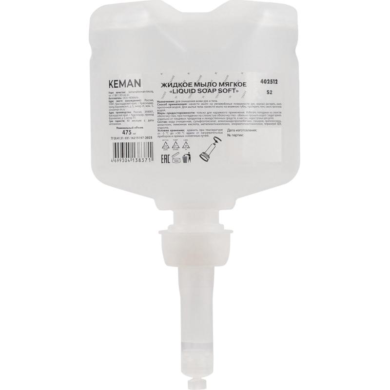 Картридж с жидким мылом для рук и тела Keman LIQUID SOAP SOFT 402512 для дозаторов S2 475 мл<br><br><b>Назначение:</b> картридж с жидким мылом Keman Liquid Soap Soft 402512 предназначен для очищения кожи рук и тела.<br><b>Способ применения:</b> нанести мыло на увлажнённые поверхности рук, хорошо растереть, смыть проточной водой. Для мытья тела: нанести мыло на влажную губку, протереть тело, смыть проточной водой.<br><b>Меры предосторожности:</b> только для наружного применения. Избегать попадания на слизистую оболочку глаз; при попадании — обильно промыть водой. Хранить отдельно от пищевых продуктов и лекарственных средств, в местах, недоступных для детей.<br><b>Состав:</b> вода очищенная, сульфоэтоксилат, алкиламидопропилбетаин, глицерин, пропиленгликоль, аллантоин, отдушка, лимонная кислота, метилизотиазолинон, хлорметилизотиазолинон, тетранатрий ЭДТА.<br><b>Условия хранения:</b> хранить при температуре от —5°C до +30°C вдали от нагревательных приборов и прямых солнечных лучей.<br><b>Срок годности:</b> 60 месяцев с даты изготовления.