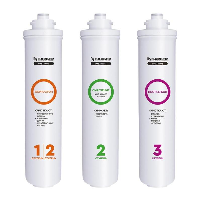 Картридж сменный Барьер Эксперт (защищает от накипи и железа).<BR>Картриджи семейства Барьер Эксперт. Позволяют получить вкусную безопасную воду и забыть о проблеме накипи, металлическом привкусе воды и желтоватом осадке в чайнике. <BR>В комплект входит:<BR>1.«Барьер Эксперт Ферростоп' содержит специальный многослойный материал, эффективно удаляющий не только железистые примеси, но и растворенное железо. Финишный слой препятствует сбросу отфильтрованного железа в чистую воду.<BR>2.«Барьер Эксперт Смягчение» предотвращает образование накипи. Эффективно снижает карбонатную жесткость, <nobr>из-за</nobr> которой образуется осадок в чайнике. Средний ресурс ступени при жесткости от 3 до 5 <nobr>мг-экв</nobr>/л составляет 500 литров. <BR>3.«Барьер Эксперт ПостКарбон» — финишная очистка и кондиционирование, устранение неприятных привкусов и остаточного хлора.<BR>В линейке Эксперт воплощены наши лучшие разработки, что дает вам преимущества:<BR>-технология SmartLock предотвращает протечки и срыв картриджа под давлением. <BR>-технология OneTouch позволяет быстро поменять картридж без специальных знаний, инструментов или ключей.<BR>-Протестированы по стандарту NSF (США) на максимальное давление 30 АТМ. <nobr>4-х</nobr> кратный запас прочности. Производительность — 2 л/мин. Ресурс — 10000 литров. <BR>Один проточный фильтр Барьер за год помогает уберечь планету от полтонны пластика. По исчерпанию ресурса картриджи можно сдать на переработку.