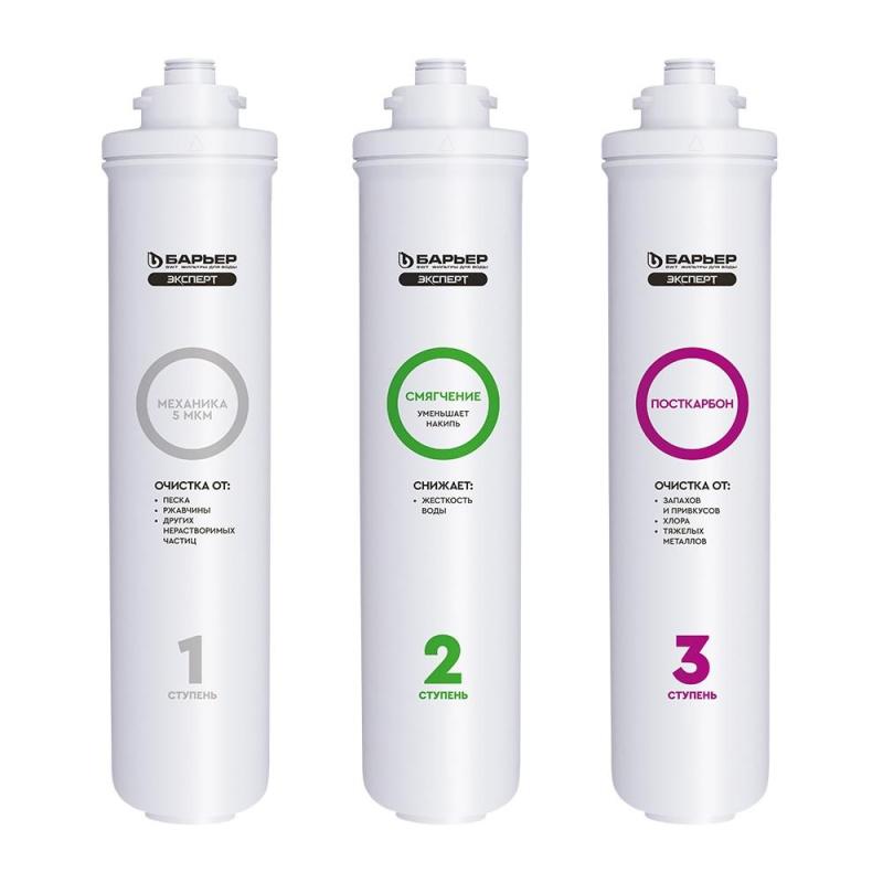 Картридж сменный Барьер Эксперт (защита от накипи).<BR>Картриджи семейства Барьер Эксперт для специализированной очистки воды с повышенным содержанием солей жесткости. Позволяют забыть о проблеме накипи и получить вкусную безопасную воду. <BR>В комплект входят картриджи:<BR>1. «Барьер Эксперт Механика» эффективно удаляет любые механические примеси до 5 мкм (песок, пластик, ржавчину <nobr>и т. д.</nobr>).<BR>2. «Барьер Эксперт Смягчение» предотвращает образование накипи. Эффективно снижает карбонатную жесткость, <nobr>из-за</nobr> которой образуется осадок в чайнике. Средний ресурс ступени при жесткости от 3 до 5 <nobr>мг-экв</nobr>/л составляет 500 литров. <BR>3. «Барьер Эксперт ПостКарбон» — финишная очистка и кондиционирование, устранение неприятных привкусов и остаточного хлора.<BR>В линейке Эксперт воплощены наши лучшие разработки, что дает вам преимущества:<BR>— технология SmartLock предотвращает протечки и срыв картриджа под давлением. <BR>— технология OneTouch позволяет быстро поменять картридж без специальных знаний, инструментов или ключей.<BR>— система протестирована по стандарту NSF (США) на максимальное давление 30 АТМ. <nobr>4-х</nobr> кратный запас прочности. Производительность — 2 л/мин. Ресурс 10000 литров. <BR>Один проточный фильтр Барьер за год помогает уберечь планету от полтонны пластика. По исчерпанию ресурса картриджи можно сдать на переработку.