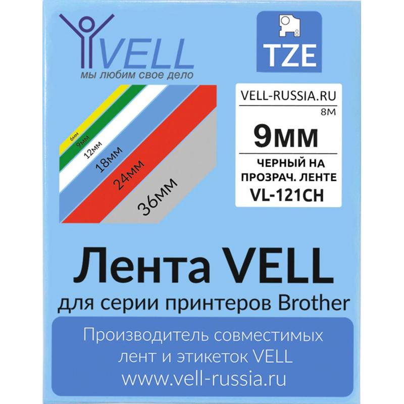 Картридж Vell для принтера этикеток Brother 9 мм х 8 м цвет прозрачный шрифт чёрный<br><br>Высококачественная ламинированная лента Vell-121CH с чипом от торговой фирмы разработана специально для маркировки прямых поверхностей. Ленты шириной 9 мм и длиной 8 метров прекрасно держатся на разнообразных ровных, окрашенных, шероховатых или очень грубых поверхностях за счёт уникального клеящегося слоя. Применяется для маркировки проводов, щитков, печати ценников и пр. Лента устойчива ультрафиолету и попаданию влаги.<br><br>Совместимые модели печатающих устройств: PT D210, PT H110, PT E110, PT E100, PT H105, PT D200, PT E300, PT D450, PT E550, PT D600, PT P700, PT P900, PT 9700, PT-1010, PT-1280, PT-2700.<br><br>Лента Vell имеет прозрачный цвет подложки и чёрный цвет текста, сделаны из высококачественного материала — полиэтилентерефталат. Применяется в принтерах Brother, Puty. Выдерживают диапазон температур от −40°C до +80°C.