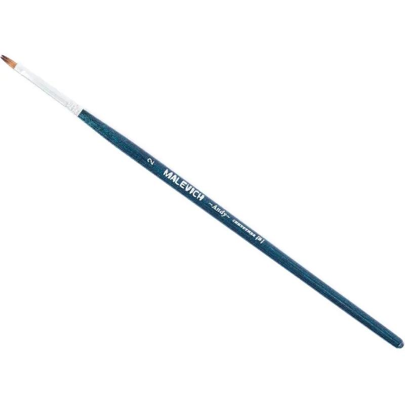 Кисть художественная Малевичъ Andy плоская синтетика №2<br><br>Кисть из синтетики серии Andy — это мягкая универсальная синтетика, которая подходит практически для любых видов красок. <br>Ей удобно работать с гуашью, маслом, акварелью, акрилом, темперой. Маслом можно работать в лессировочной технике с разбавителем. <br>Синтетика рыжего цвета с темным кончиком, ручка покрыта синим лаком, ворс закреплен втулкой из латуни с двойной обжимкой.<br>Ручка кисти короткая — 14 см. <br>Длина ворса (выставка) короткая. <br>Номер кисти соответствует диаметру пучка в мм.
