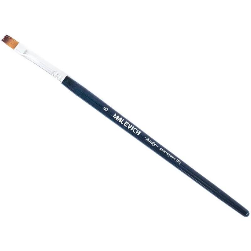 Кисть художественная Малевичъ Andy плоская синтетика №6<br><br>Кисть из синтетики серии Andy — это мягкая универсальная синтетика, которая подходит практически для любых видов красок. <br>Ей удобно работать с гуашью, маслом, акварелью, акрилом, темперой. Маслом можно работать в лессировочной технике с разбавителем. <br>Синтетика рыжего цвета с темным кончиком, ручка покрыта синим лаком, ворс закреплен втулкой из латуни с двойной обжимкой.<br>Ручка кисти короткая — 14 см. <br>Длина ворса (выставка) короткая. Номер кисти соответствует диаметру пучка в мм.
