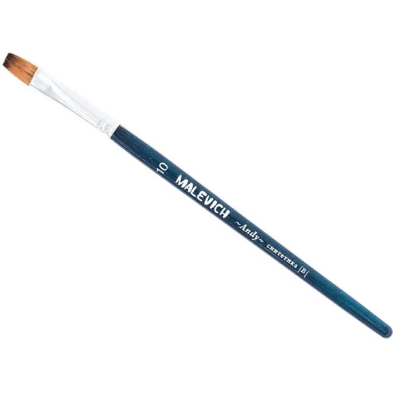Кисть художественная Малевичъ Andy плоская синтетика №10<br><br>Кисть из синтетики серии Andy — это мягкая универсальная синтетика, которая подходит практически для любых видов красок. <br>Ей удобно работать с гуашью, маслом, акварелью, акрилом, темперой. Маслом можно работать в лессировочной технике с разбавителем. <br>Синтетика рыжего цвета с темным кончиком, ручка покрыта синим лаком, ворс закреплен втулкой из латуни с двойной обжимкой.<br>Ручка кисти короткая — 14 см. <br>Длина ворса (выставка) короткая. <br>Номер кисти соответствует диаметру пучка в мм.