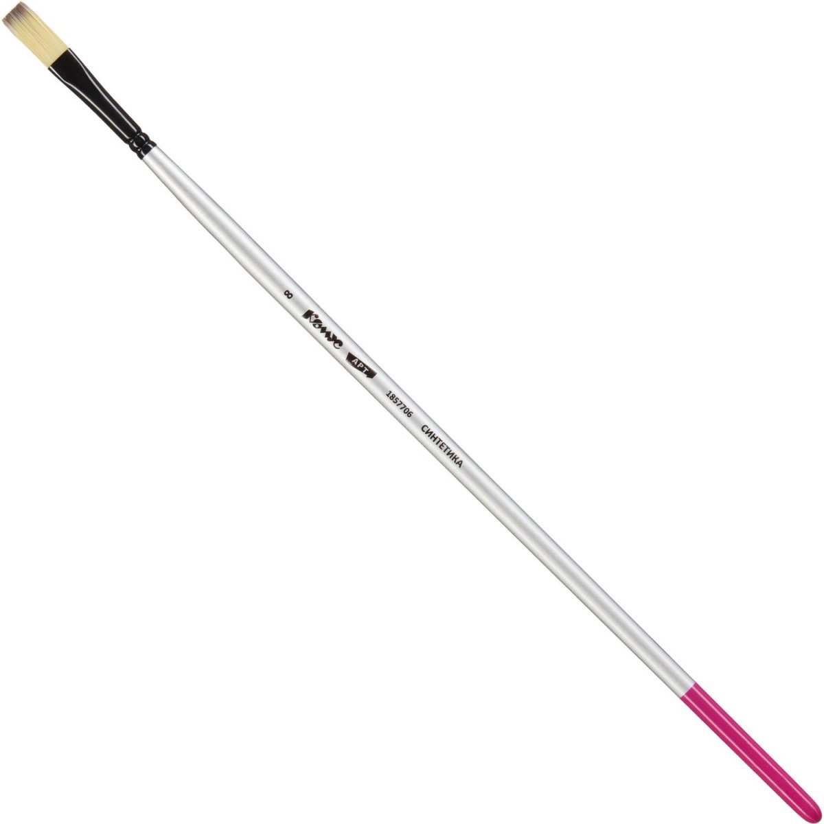 Кисть художественная Комус Арт плоская синтетика № 8 деревянная ручка. Художественная кисть Комус Арт — это незаменимый инструмент для художников и любителей живописи, который поможет реализовать творческие идеи и создать яркие шедевры. Особенности и преимущества изделия: синтетический ворс — средней жесткости, эластичный, обеспечивает плавное и точное нанесение краски, а значит — ровные и красивые штрихи. Плоская форма идеально подходит для рисования ровных линий и быстрой закраски. Длинные ручки обеспечивают удобный хват и контроль над кистью во время работы с большими форматами холста. Прочный материал — деревянная ручка и качественный синтетический волос обеспечивают долговечность кисти. Универсальность: кисть Комус Арт подходит для работы с разными видами красок — акварелью, акрилом, гуашью, темперой, тушью. Идеальна для использования в художественных училищах, творческих кружках или же просто в домашних условиях.
