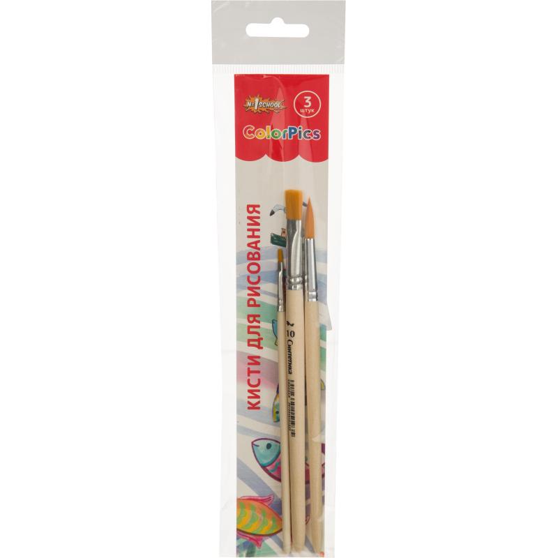 Набор кистей Комус Класс (№1 School) ColorPics синтетика (3 штуки в наборе) деревянная ручка<br><br>Набор кистей для рисования включает три кисти из синтетического волокна: круглую №6 и плоские №2 и №10. Синтетический пучок отличается жёсткостью, упругостью и износостойкостью, хорошо удерживает краску и обеспечивает ровное, контролируемое нанесение. Такие кисти подойдут для работы с темперой, акрилом, гуашью и маслом, позволяя выполнять как тонкие линии, так и широкие мазки.<br><br>Ручки деревянные, короткие, длиной 158 мм, удобно лежат в руке и обеспечивают точность движений при рисовании. Набор упакован в полиэтиленовый пакет.