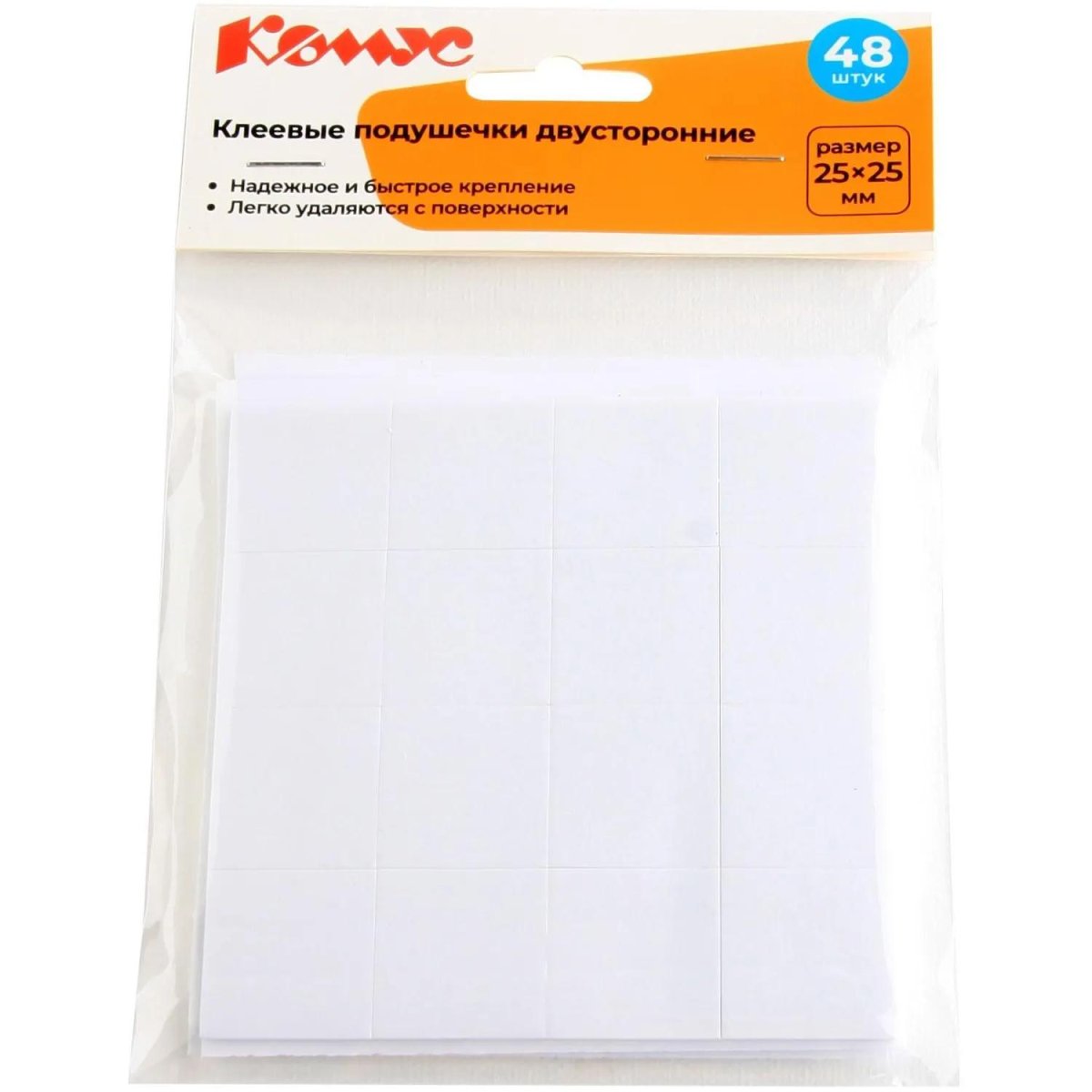 Клеевые подушечки Комус 25×25 см на клеевой основе (48 штук в упаковке)<br><br>Клеевые подушечки подходят для двустороннего крепления лёгких предметов и обеспечивают прочное сцепление без следов после снятия. Они имеют квадратную форму размером 25×25×2 мм и выдерживают нагрузку до 800 г, что удобно для фиксации декоративных элементов и небольших аксессуаров. Подушечки окрашены в белый цвет и крепятся на клеевой основе. Листы упакованы в мешок OPP с бумажным верхом.<br><br>Внешний вид и/или характеристики товара могут быть изменены производителем в соответствии с производственным процессом.