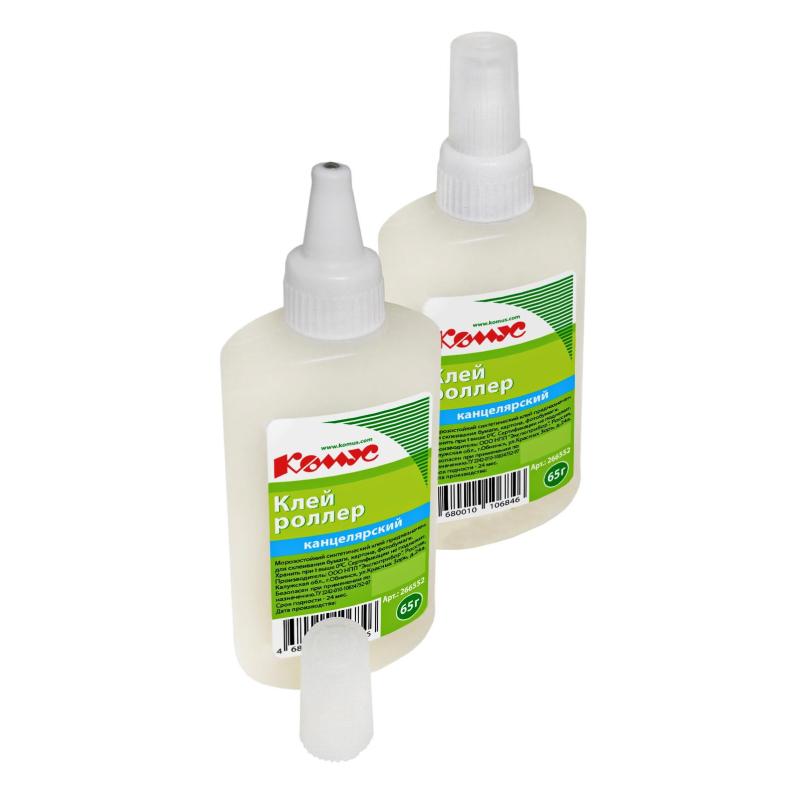 Канцелярский клей ’Комус’ с аппликатором-роллером (шарик из нержавеющей стали), который обеспечивает легкое и равномерное нанесение. Объем — 65 мл, бесцветный. Применяется для склеивания бумаги, картона, декоративных и поделочных работ. Съемный колпачок предохраняет клей от засыхания. Клей морозостойкий. Выдерживает 4 цикла заморозки/разморозки при температуре до −30 С (длительностью не более 15 суток). Клей имеет консистенцию — гель.<br>Способ применения: Перед применением клей следует тщательно взболтать. Далее равномерно нанести клей на одну из склеиваемых поверхностей, соединить их и прижать. После использования плотно закройте колпачок, чтобы избежать высыхания клеевой массы. Время схватывания — не менее 60 с.