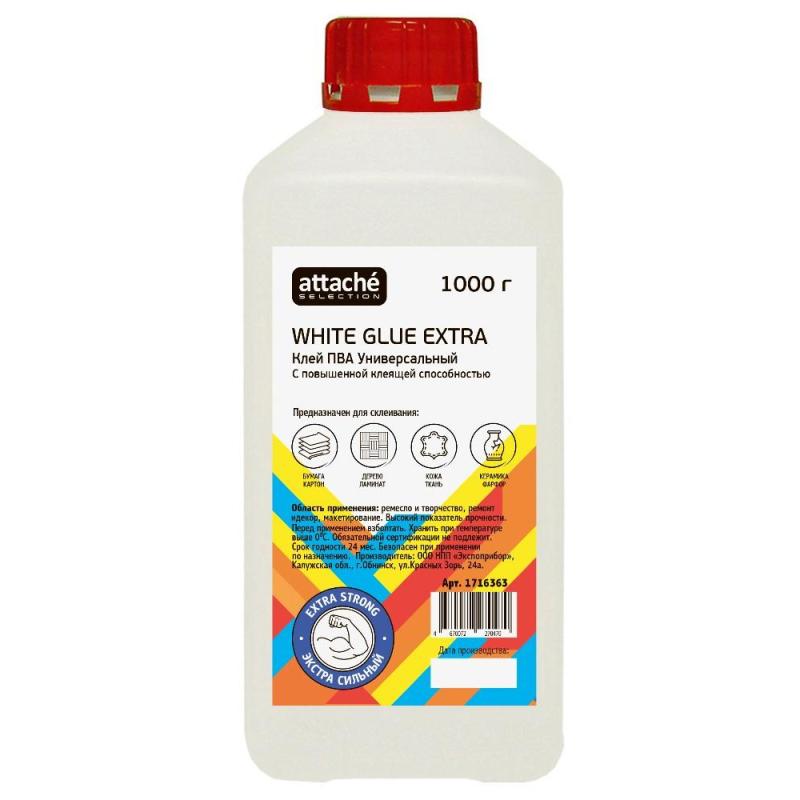 Морозостойкий Клей ПВА Attache (Attache Selection) Extra 1 кг обладает повышенной клеящей способностью. Предназначен для ответственных работ по склеиванию изделий из дерева, бумаги, картона, кожи, тканей, фарфора. Клей обеспечивает надёжные результаты при наклейке тяжёлых обоев, линолеума, керамической плитки. Клей не токсичен и безопасен при применении по назначению. Перед применением клей необходимо перемешать и, очистив склеиваемые поверхности от загрязнений и просушив их, нанести клей, соединить и прижать. Склеиваемое соединение надо оставить в сжатом состоянии не менее чем на 2 часа. Время полного высыхания при температуре 20С и относительной влажности воздуха 65% — 24 часа. Клей морозостойкий и не теряет своих свойств после 4 циклов замораживания-размораживания при температуре −40. Состав не токсичен и безопасен при применении по назначению.<br><br>В рамках ребрендинга производится перевод данного артикула с ТМ Attache (Attache Selection) на ТМ Attache с сохранением всех потребительских характеристик товара. На переходный период допускается поставка данной продукции в двух вариантах дизайна.