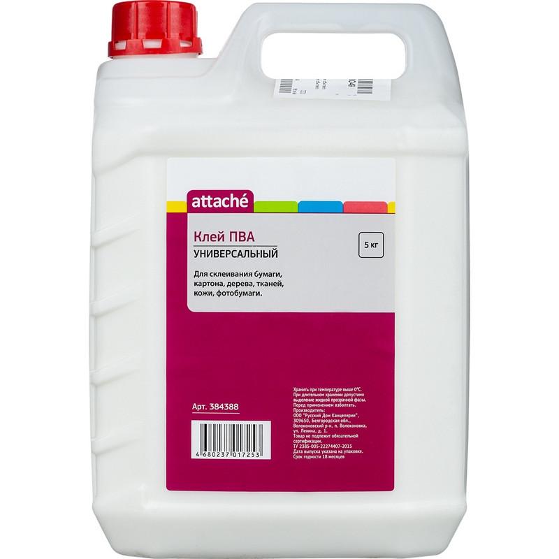 Клей ПВА Attache предназначен для склеивания бумаги, картона, дерева, ткани, кожи, фотобумаги. Отлично подходит для хобби и творчества для взрослых и детей. Пластиковый дозатор обеспечивает точное нанесение и экономный расход. Имеется съемный колпачок, который предохраняет клей от засыхания.<br>Объем клея 5000 г (4948,7 мл).<br>Клей ПВА при минусовых температурах замерзает, т.к. сделан на основе воды, но при оттаивании не теряет своих свойств. Его можно заморозить и размораживать 5 раз, и он не потеряет ни своих свойств, ни товарного вида. Температура воздуха при использовании не ниже +5. Необходимо взболтать перед применением. Большой объем позволит надолго обеспечить сотрудников необходимым товаром, и сэкономить офисный бюджет.