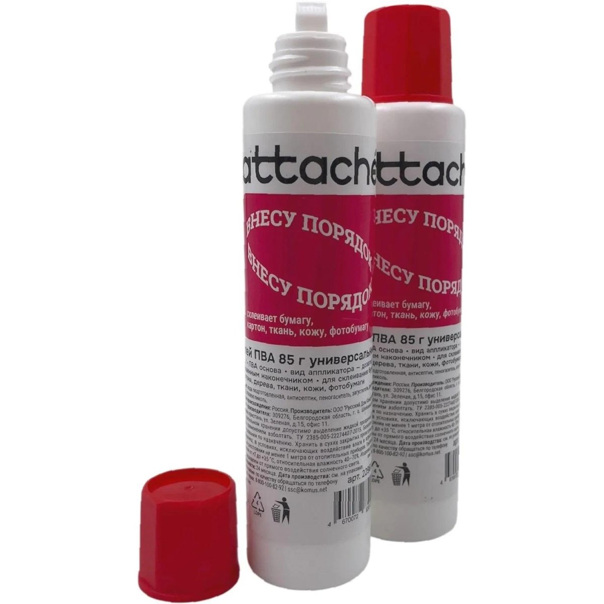 Клей ПВА Attache 85 г с дозатором морозостойкий<br><br>Клей ПВА Attache предназначен для склеивания бумаги, картона, дерева, ткани, кожи, фотобумаги. Подходит для хобби и творчества для взрослых и детей. У данного клея имеется скошенный пластиковый дозатор, который обеспечивает равномерное распределение клея по поверхности. Пластиковый дозатор обеспечивает точное нанесение и экономный расход. Имеется съемный колпачок, который предохраняет клей от засыхания.<br>Объем клея 85 г (84.1 мл).<br>Клей ПВА при минусовых температурах замерзает, т.к. сделан на основе воды, но при оттаивании не теряет своих свойств. Его можно заморозить и размораживать 5 раз, и он не потеряет ни своих свойств, ни товарного вида. Температура воздуха при использовании не ниже +5. Необходимо взболтать перед применением. 0.36kH (1.15Мпа).