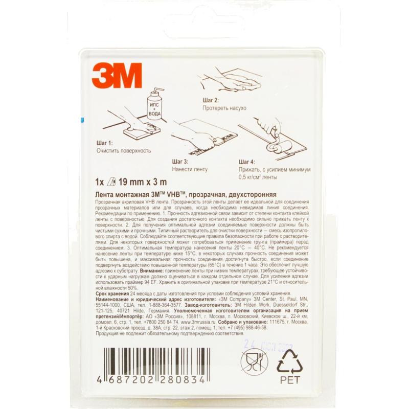 Клейкая лента двухсторонняя монтажная 3M VHB <nobr>4910F</nobr> прозрачная на вспененной основе 19 мм x 3 м<br><br>Прозрачность ленты 3M VHB делает её идеальной для соединения прозрачных материалов или для случаев, когда необходима невидимая линия соединения. Ленты VHB подходят как для внутреннего, так и для наружного промышленного применения с самыми разнообразными поверхностями, включая загрунтованное дерево, большинство пластиков, композиты и металлы.<br><br>Преимущества:<br>— Подходит для склеивания прозрачных материалов;<br>— Устойчива к солнечному свету;<br>— Подходит для неровных поверхностей;<br>— Для применения как в помещении, так и на улице;<br>— Диапазон температур: от −40 °С до +90 °С;<br>— Выдерживает нагрузку 6 кг/1 м.<br>