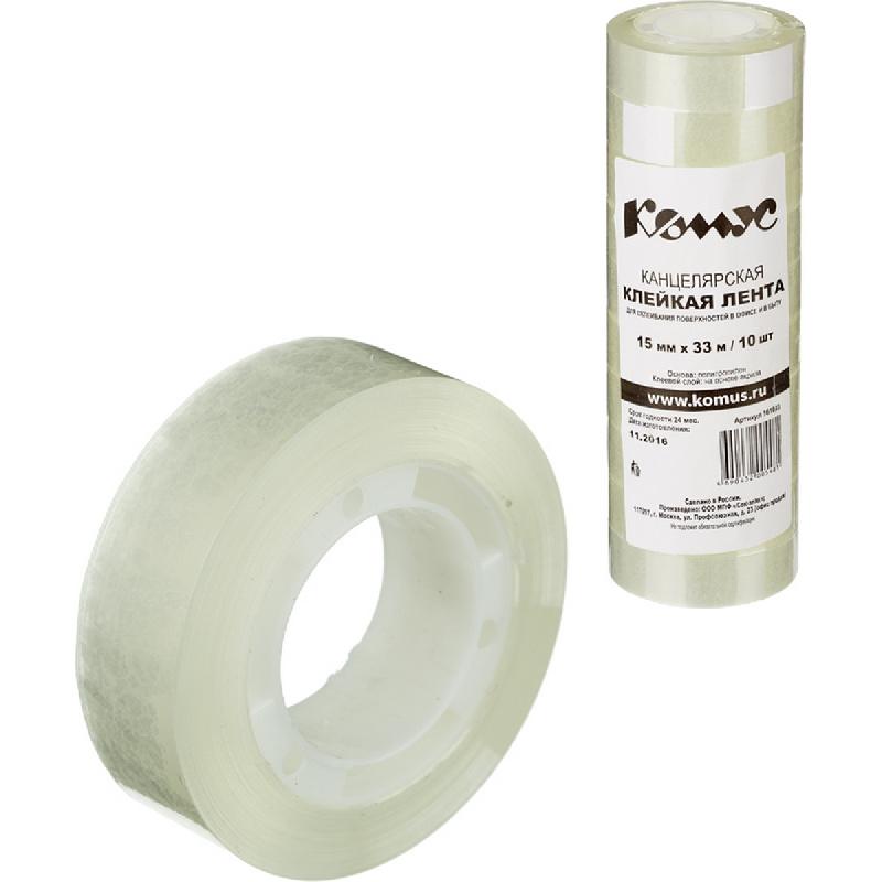 Канцелярская клейкая лента Комус разработана специально для канцелярских нужд.<br><br>Подойдет для решения большинства задач в офисе, школе и дома, связанных с упаковкой, запечатыванием, мелким ремонтом и творчеством.<br><br>Имеет гарантированную длину 33 м и ширину 15 мм и обладает высокой клеящей способностью. Отличается прозрачностью и прочностью 35 мкм. <br><br>Имеет специальное покрытие, благодаря которому разматывается равномерно и легко.<br><br>Упаковка — термоусадка из 10 роликов.<br><br>Канцелярская клейкая лента Комус проста и удобна в использовании.