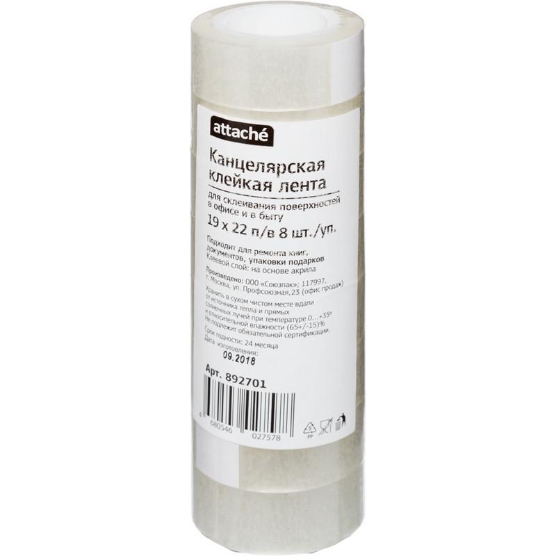 Канцелярская клейкая лента Attache разработана специально для канцелярских нужд.<br><br>Подойдет для решения большинства задач в офисе, школе и дома, связанных с упаковкой, запечатыванием, мелким ремонтом и творчеством.<br><br>Имеет гарантированную длину 22 м и ширину 19 мм и обладает высокой клеящей способностью. Отличается прозрачностью и прочностью 35 мкм. <br><br>Имеет специальное покрытие, благодаря которому разматывается равномерно и легко.<br><br>Упаковка — термоусадка из 8 роликов.<br><br>Канцелярская клейкая лента Attache проста и удобна в использовании.