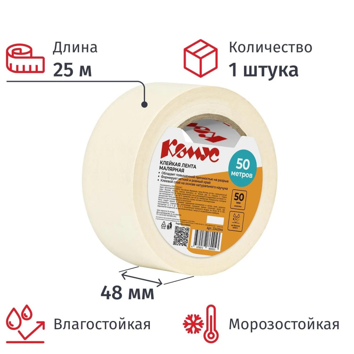 Клейкая лента малярная Комус 50 мм x 50 м влагостойкая морозостойкая белая<br><br>Клейкая лента малярная белого цвета, ширина 50 мм, длина 50 метров. Применяется для локальной защиты поверхности при проведении малярных, штукатурных и строительных работ. Обеспечивает чёткие границы при окрашивании. Основа клейкой ленты — крепированная бумага с влагостойкой пропиткой. Клеевой слой — натуральный каучук на основе растворителя. Рабочая температура: от — 10 до +60 градусов.<br>Основные преимущества продукта:<br>— влагостойкость, совместимость с различными типами красок;<br>— шероховатая поверхность ленты позволяет предотвратить растекание краски;<br>— лёгкость в использовании, отрывается руками;<br>— благодаря особенностям клеевого слоя ленты, не оставляет следов клея после удаления в течение 24 часов;<br>— хорошая адгезия к поверхности;<br>— цветная информативная этикетка.<br><br>Количество лент в упаковке: 1 штука.<br>Количество упаковок в транспортном коробе: 36 штук.