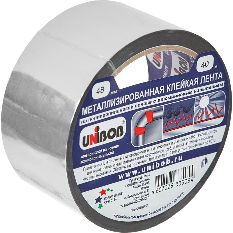 <p>Металлизированная клейкая лента Unibob с алюминиевым напылением применяется для различных типов строительных и ремонтных работ. Лента изготовлена на полипропиленовой основе с алюминиевым напылением, клеевой слой на акриловой основе обеспечивает высокую адгезию.<br><br>Используется для герметизации соединительных швов воздуховодов, труб, монтажа вентиляционных систем и систем кондиционирования. Подходит для ремонта и восстановления декоративных элементов из алюминия. Также применяется для предотвращения коррозии поверхностей, защиты оборудования от проникновения пыли, пара, других нежелательных сред. С помощью металлизированной ленты просто выполнить герметизацию поверхностей и стыков как на производстве, так и в быту. Важнейшим достоинством ленты с металлизированным напылением является ее свойство отражать ультрафиолетовое излучение. Из-за таких свойств она широко используется для термоизоляции и в иных ремонтных работах. <br><br>Температура крепления: от 10 до 30 градусов по Цельсию. Рабочая температура : от −10 до 95 градусов по Цельсию.<br>Толщина ленты — 50 мкм. Цвет: серый. Ширина ленты — 48 мм, длина намотки — 40 м.<br>Количество в упаковке: 1 шт.<br>Количество упаковок в транспортном коробе: 36.</pr>