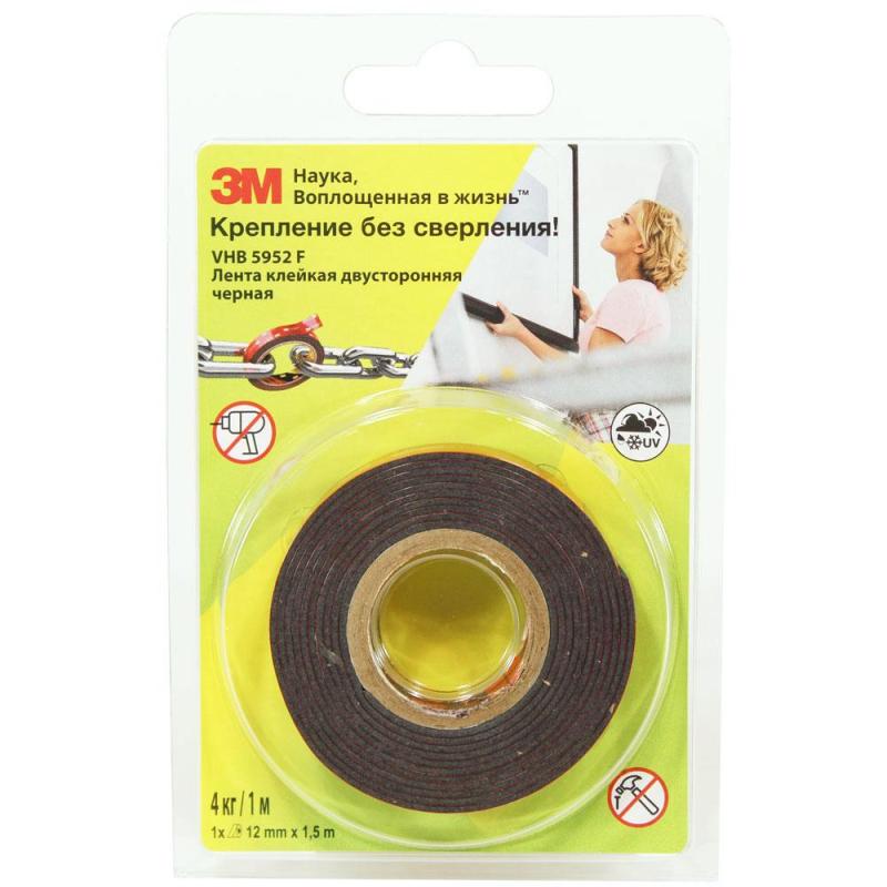 Клейкая лента двусторонняя монтажная 3M сверхсильная для больших нагрузок и экстремальных условий эксплуатации: может использоваться как внутри, так и вне помещений при температуре от 40 С до 90 градусов (кратковременно до 150 градусов). Материал основы — вспененный акрил. Толщина ленты: 1100 мкм.<BR><BR>Акриловая клеевая система с агрессивной клейкостью обеспечивает надежное соединение большинства материалов. Рекомендуемая расчетная нагрузка 10 кг/ 1 м.п ленты. Высокая вязкоэластичность при любой погоде — лента отлично компенсирует различия температурного расширения при соединении разнородных материалов: металл/пластик, металл/дерево, металл/керамика.<BR><BR>Акриловая вспененная основа с закрытыми ячейками и низкой плотностью (0,55/куб.см) обеспечивает высокую степень прилегания и низкую звукопроводность — лента может применяться для шумоизоляции помещений и автомобилей. Высокая влаго- и <nobr>УФ-стойкость</nobr>. Высокая стойкость к большинству растворителей, включая бензин, спирт, моторные масла, ацетон и другие: лента может использоваться для герметизации.<BR><BR>Цвет ленты — черный.<BR>Размеры ленты: длина — 1,5 м, ширина — 12 мм. Толщина — 1100 мкм.<BR><BR>Количество лент в упаковке — 1 шт.<BR>Количество упаковок в коробе — 60 шт.