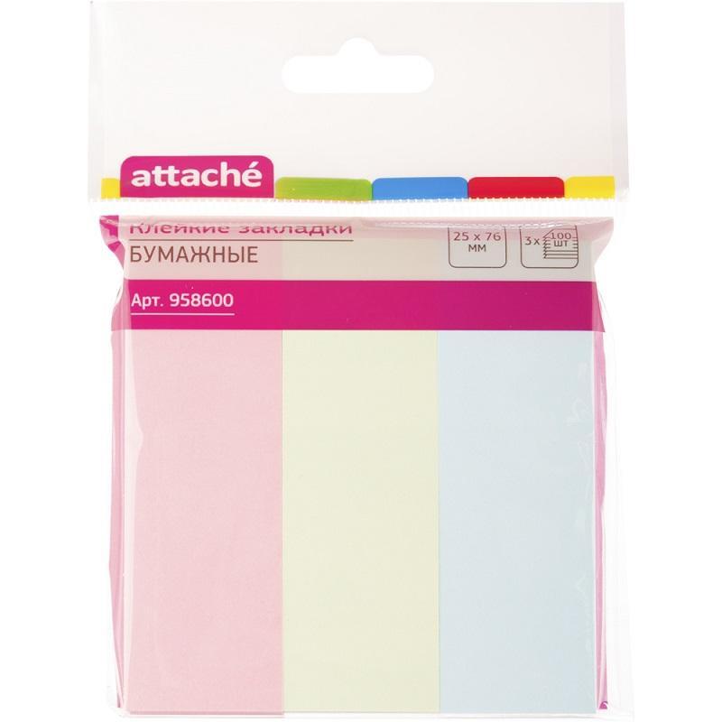 Клейкие закладки Attache, ширина которых составляет 25 мм, могут служить закладками в документах, использоваться для записи краткой информации, для выделения текста. Клейкие закладки легко удаляются, не оставляя следов и не повреждая бумагу. Одну закладку можно использовать несколько раз. Размер одной закладки 25×76 мм. На закладках можно писать ручкой, чернографитовым карандашом, маркером, фломастером. В упаковке 3 пастельных цвета по 100 листов каждого цвета.<br><br>Чтобы увеличить срок службы закладок, пожалуйста, следуйте рекомендациям:<br><br>1. Отделять закладку от блока следует вдоль клеевой полосы. Так можно избежать скручивания и последующего отклеивания закладки.<br>2. Прежде чем наклеивать закладку, убедитесь в отсутствии грязи и пыли на поверхности. На чистой поверхности срок службы клеевого слоя более продолжителен.<br><br>Внимание! — Цвета в наборе могут отличаться от указанных на фото.