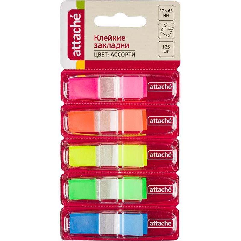 Пластиковые клейкие закладки Attache, ширина которых составляет 12 мм, могут служить закладками в документах, использоваться для записи краткой информации, для выделения текста. Яркие неоновые цвета закладок акцентируют Ваше внимание на нужном моменте в документе или тексте.<br><br>Прозрачный пластик, из которого они изготовлены, не скрывает при этом самого текста. Клейкие закладки легко удаляются, не оставляя следов и не повреждая бумагу. Одну закладку можно использовать несколько раз. Размер одной закладки 12×45 мм. На закладках можно писать ручкой, чернографитовым карандашом, маркером, фломастером. В упаковке 5 ярких неоновых цветов по 25 листов каждого цвета.<br><br>Чтобы увеличить срок службы закладок, пожалуйста, следуйте рекомендациям:<br><br>1. Отделять закладку от блока следует вдоль клеевой полосы. Так можно избежать скручивания и последующего отклеивания закладки.<br>2. Прежде чем наклеивать закладку, убедитесь в отсутствии грязи и пыли на поверхности. На чистой поверхности срок службы клеевого слоя более продолжителен.