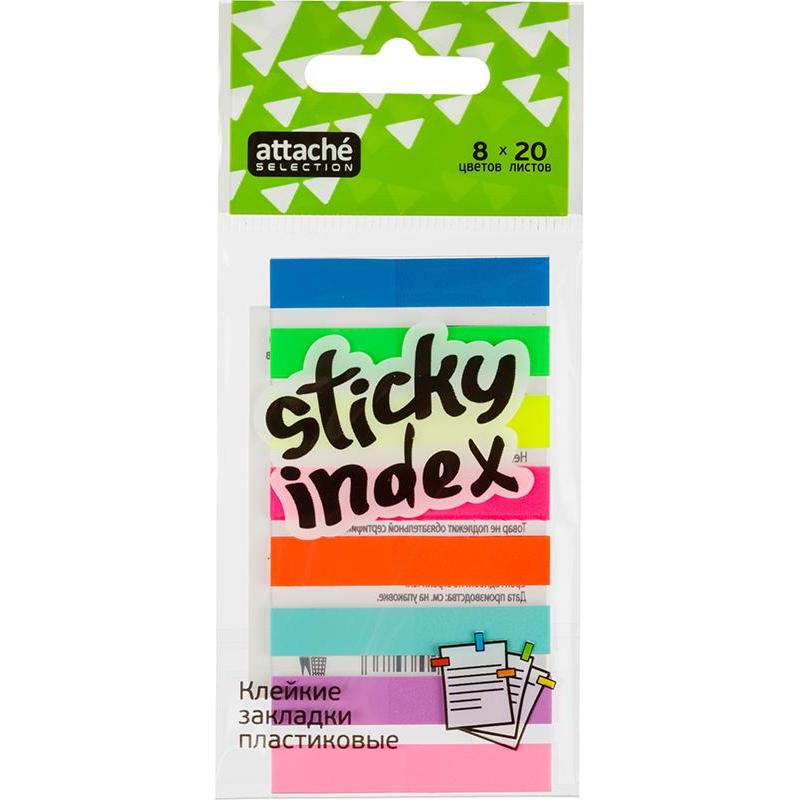 Пластиковые клейкие закладки Attache Selection, ширина которых составляет 8 мм, могут служить закладками в документах, использоваться для записи краткой информации, для выделения текста. Яркие неоновые цвета закладок акцентируют Ваше внимание на нужном моменте в документе или тексте.<br><br>Прозрачный пластик, из которого они изготовлены, не скрывает при этом самого текста. Клейкие закладки легко удаляются, не оставляя следов и не повреждая бумагу. Одну закладку можно использовать несколько раз. Размер одной закладки 8×45 мм. На закладках можно писать ручкой, чернографитовым карандашом, маркером, фломастером. В упаковке 8 ярких неоновых цветов по 20 листов каждого цвета.<br><br>Чтобы увеличить срок службы закладок, пожалуйста, следуйте рекомендациям:<br><br>1. Отделять закладку от блока следует вдоль клеевой полосы. Так можно избежать скручивания и последующего отклеивания закладки.<br>2. Прежде чем наклеивать закладку, убедитесь в отсутствии грязи и пыли на поверхности. На чистой поверхности срок службы клеевого слоя более продолжителен.