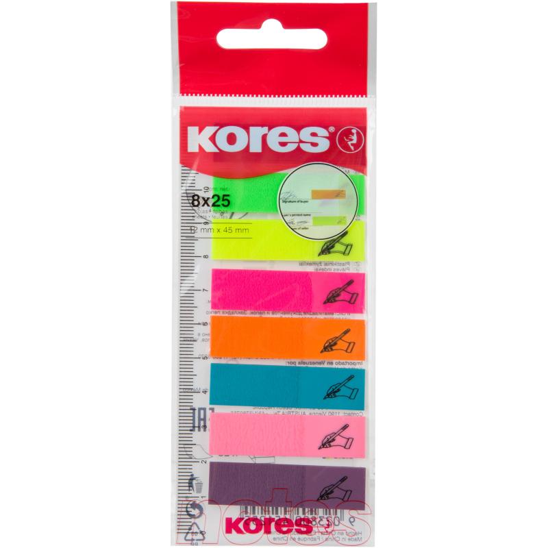 Клейкие закладки Kores, ширина которых составляет 12 мм, могут служить закладками в документах, использоваться для записи краткой информации, для выделения текста, указания поля для подписи. Яркие неоновые цвета закладок акцентируют Ваше внимание на нужном моменте в документе или тексте. Прозрачный пластик, из которого они изготовлены, не скрывает при этом самого текста. Клейкие закладки легко удаляются, не оставляя следов и не повреждая бумагу. Одну закладку можно использовать несколько раз. Размер одной закладки 12×45 мм. На закладках можно писать ручкой, чернографитовыми карандашом, маркером, фломастером. В упаковке 8 ярких неоновых цветов по 25 листов каждого цвета.<br><br>Чтобы увеличить срок службы закладок, пожалуйста, следуйте рекомендациям:<br><br>1. Отделять закладку от блока следует вдоль клеевой полосы. Так можно избежать скручивания и последующего отклеивания закладки.<br>2. Прежде чем наклеивать закладку, убедитесь в отсутствии грязи и пыли на поверхности. На чистой поверхности срок службы клеевого слоя более продолжителен.