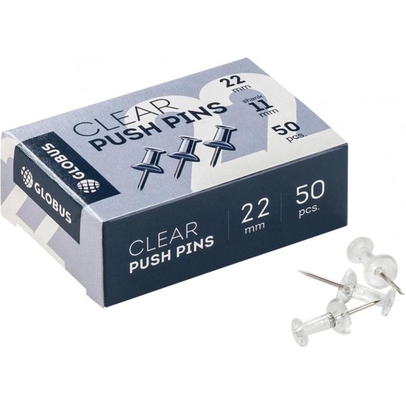 Канцелярские кнопки — силовые, прозрачные. Размер — 22 мм, длина иглы — 11 мм. В картонной упаковке 50 штук.