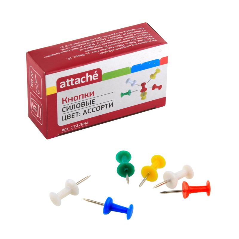 <p>Кнопки силовые с пластиковым цветным держателем, Длина кнопки — 17.5, длина иглы — 11 мм. Картонный короб удобен для хранения и защищает от самопроизвольного высыпания кнопок. В коробке 50 штук кнопок силовых разного цвета. Используются для крепления информации к доскам пробкового типа, для планирования и отметок.</p>