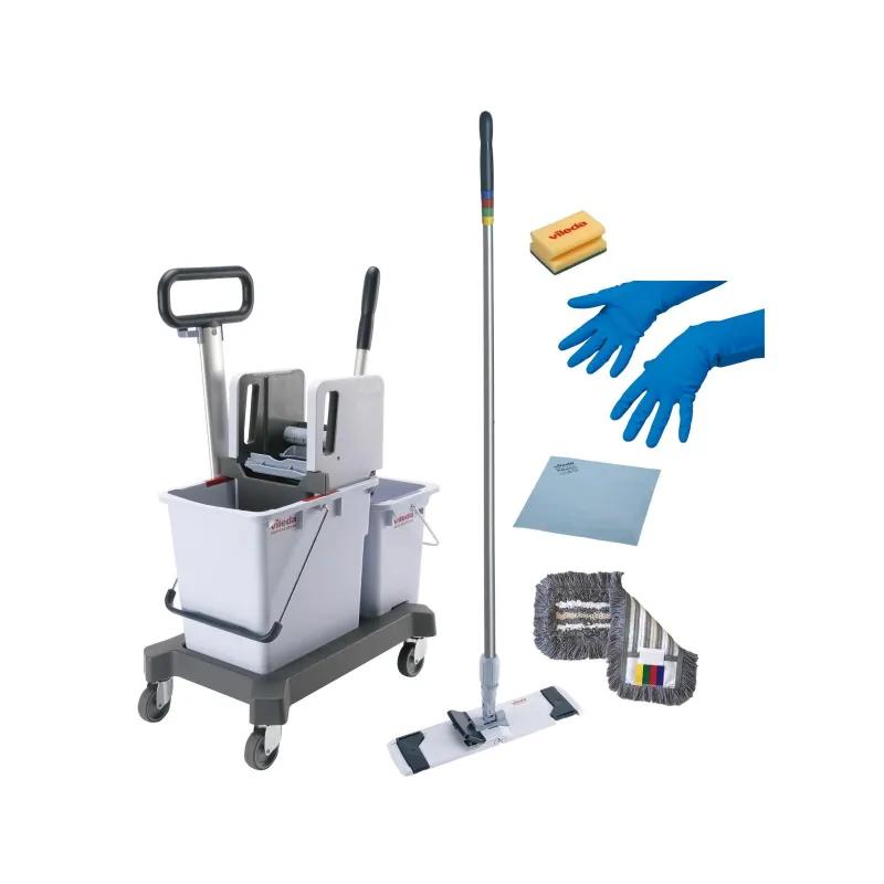 Тележка уборочная Vileda Professional КомбиСпид Про2-ведерная с отжимом 1x25 л 1x10 л (швабра флаундер, МОП, салфетка, перчатки, губка) (арт. производителя 540414).Особенности и преимущества:- продуманная и готовая к использованию комплектация для уборки типовых загрязнений с повышенным вниманием к эргономике уборки;- комплект всех необходимых для уборки расходных материалов: моп, салфетка, губка, перчатки - экономит время на их поиск и заказ;- высококачественный, износостойкий и прочный инвентарь с максимально долгим сроком службы;- эффективная очистка поверхностей с помощью микроволокна;- цветовая кодировка мопов предотвращает перекрестное загрязнение;- гарантия качества от европейского производителя;- подходит для уборки помещений площадью до 500 м.кв.Комплектация:1. Система двухведерная КомбиСпид Про 25 л и 10 л на платформе с вертикальным отжимом, с транспортировочной ручкой - 1 шт2. Держатель мопов КомбиСпид Про 40 см - 1 шт3. Ручка алюминиевая с цветовой кодировкой 150 см - 1 шт4. Моп ТриоПлюс КомбиСпид 40 см - 1 шт5. Салфетка ПВАмикро, синий -1 шт6. Перчатки латексные Многоцелевые, синий, размер М -1 пара7. Губка Виледа Средняя жесткость, зеленый абразив - 1 шт