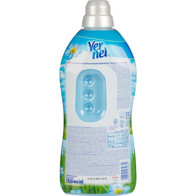 <p>Кондиционер для белья Вернель Свежий бриз 1.82 л<br><br><b>Назначение: </b> <br>Придает белью изумительный аромат свежего утреннего воздуха. Благодаря формуле Vernel с аромакапсулами кондиционер обеспечивает интенсивную свежесть до 10 недель (при хранении белья). Продукт придает белью невероятную мягкость, делая его приятным на ощупь. Гладить белье становится намного легче, а сохнет оно намного быстрее. Средство также обладает антистатическим эффектом. Благодаря удобной крышке-дозатору вы всегда будете знать, сколько средства необходимо добавить. Концентрированного средства хватает на длительное время (30 стирок). Подходит для всех видов тканей.<br>4 свойства кондиционера для белья Vernel:<br>• Придает мягкость;<br>• Придает приятный аромат;<br>• Обладает антистатическим эффектом;<br>• Облегчает глажение.<br><b>Способ применения: </b> <br>Перед использованием рекомендуется взбалтывать. Дозируйте при помощи колпачка (1 колпачок = 70 мл).<br>— Машинная стирка:<br>30-45 мл (65 мл) средства на 4-5 кг (6-8 кг) сухого белья. Добавьте средство в отделение для кондиционера в стиральной машине.<br>— Ручная стирка:<br>20 мл средства на 10 л воды. Добавьте в воду во время последнего полоскания.<br>Избегайте непосредственного контакта средства с тканью.<br><b>Меры предосторожности: </b> <br>Осторожно. При попадании в глаза может вызвать раздражение. При попадании в глаза: осторожно промыть глаза водой в течение нескольких минут. При необходимости обратиться к врачу, показать этикетку. Беречь от детей!<br><b>Состав: </b> <br>5%-15% катионные ПАВ; <5% отдушка (в т.ч. бутилфенил метилпропиональ, гексилциннамаль, кумарин, бензилсалицилат, альфа-изометилионон), консервант, пеногаситель, краситель; глицерин, вода.<br><b>Условия хранения: </b> <br>Хранить при температуре от +5°C до +40°C.<br><b>Срок годности: </b> <br>24 месяца с даты изготовления.</p>