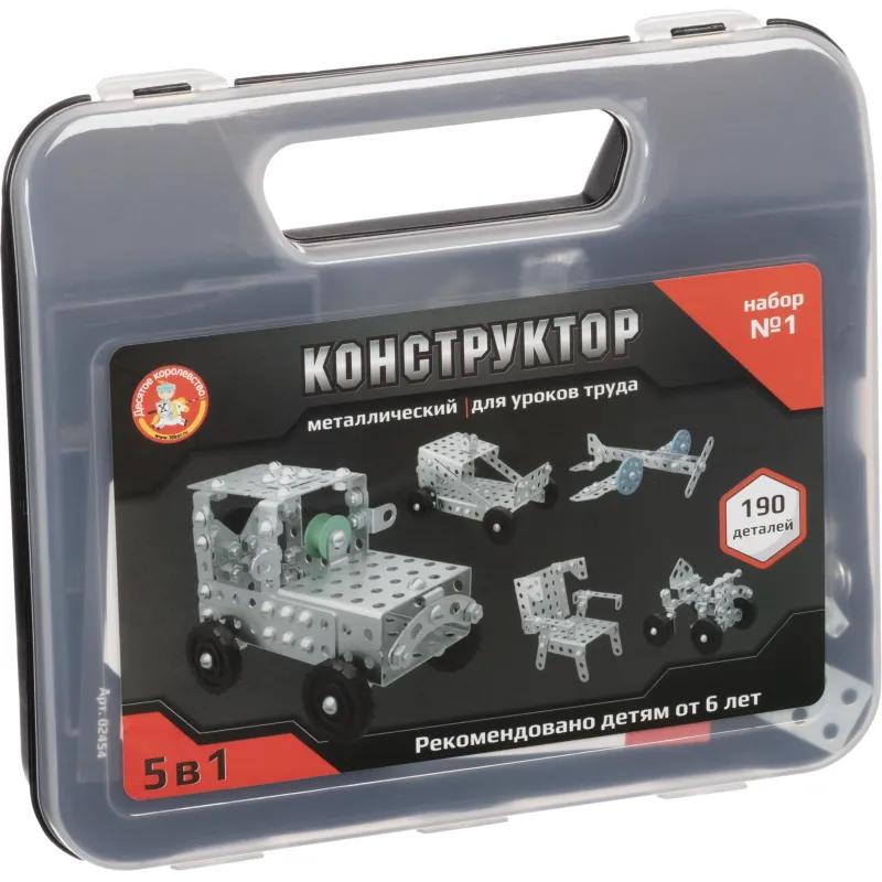 Конструктор металлический Десятое королевство Для уроков труда № 1 190 деталей <br>Металлический конструктор для уроков труда 5 в 1 «№ 1» в пластиковом чемоданчике — это универсальный набор для занятий конструированием. Из него можно собрать: багги, кресло, самолет, квадроцикл, УАЗ.<br>В состав набора входит:<br>190 элементов из металла и пластмассы<br>инструкция.<br>Игра предназначена для детей старше 6 лет.<br>Металлические детали имеют размер от 2 до 15 см, толщина металла составляет 0,8 мм. Расстояние между центрами отверстий — 10 мм. Крепёж имеет резьбу М4.<br>В инструкции вы найдете схемы сборки 5 различных моделей.<br>Занимаясь с металлическим конструктором, ребёнок осваивает основы конструирования и инженерного дела, а также развивает мелкую моторику рук, пространственное и логическое мышление.<br>Металлический конструктор для уроков труда 5 в 1 № 1 может также стать основой для творческих проектов на основе деталей конструктора.