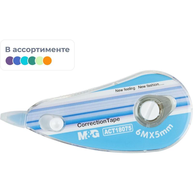 Корректирующая лента M&G предназначена для исправления текста на любом типе бумаги. Не требует длительного высыхания, можно сразу писать по исправленному тексту. Защитный колпачок защищает ленту от повреждения. Имеет функцию подкручивания. Общая длина корректирующей ленты — 6 м, ширина — 5 мм.<br> Товар поставляется в нескольких вариантах цвета корпуса (без возможности выбора).