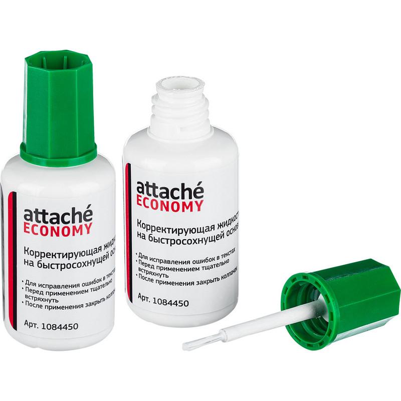 Корректирующая жидкость Attache Economy применяется для корректировки всех типов документов, включая бумагу для факсов. Ложится ровным гладким слоем, создает непрозрачное покрытие. Имеет быстросохнущую масляную основу. Во флаконе есть металлический шарик (перед использованием рекомендуется встряхивать). Вид кисточки — ворс. Объем флакона с корректирующей жидкостью составляет 16 г (16 мл).<br><br>1. Перед применением тщательно встряхните средство, затем снимите колпачок. Опустите кисть (аппликатор) во флакон и затем аккуратно выньте ее. При необходимости сотрите излишки корректирующей жидкости о внутреннюю сторону горлышка флакона, а не его край. Это позволит избежать присыхания жидкости.<br>2. Равномерно нанесите средство на бумагу.<br>3. После применения плотно закройте колпачок.<br><br>Перед использованием обязательно тщательно встряхнуть несколько раз.<br>Для максимального эффекта использовать нанесение в несколько слоев.<br>