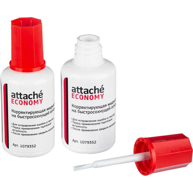 Корректирующая жидкость Attache Economy применяется для корректировки всех типов документов, включая бумагу для факсов. Ложится ровным гладким слоем, создает непрозрачное покрытие. Имеет быстросохнущую основу. Вид кисточки — ворс. Объем флакона с корректирующей жидкостью составляет 22 г. <BR>1. Перед применением тщательно встряхните средство, затем снимите колпачок. Опустите кисть (аппликатор) во флакон и затем аккуратно выньте ее. При необходимости сотрите излишки корректирующей жидкости о внутреннюю сторону горлышка флакона, а не его край. Это позволит избежать присыхания жидкости. <BR>2. Равномерно нанесите средство на бумагу. <BR>3. После применения плотно закройте колпачок. <BR>Перед использованием обязательно тщательно встряхнуть несколько раз. <BR>Для максимального эффекта использовать нанесение в несколько слоев.