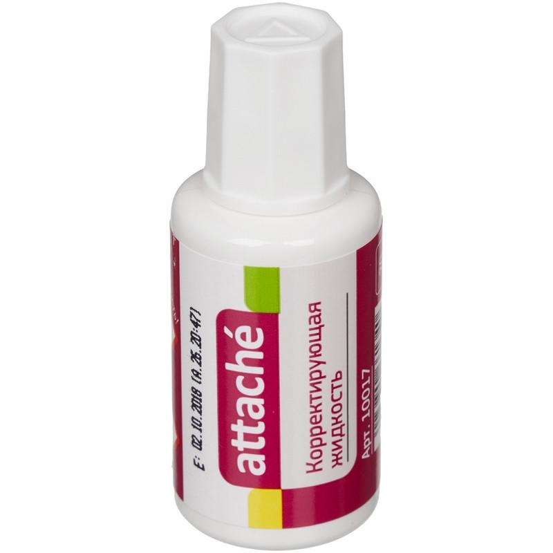 Корректирующая жидкость Attache применяется для корректировки всех типов документов, включая бумагу для факсов. Ложится ровным гладким слоем, создает непрозрачное покрытие. Имеет быстросохнущую основу. Во флаконе есть металлический шарик. Вид кисточки — ворс. Объем флакона с корректирующей жидкостью составляет 20 мл.<BR>— Перед использованием обязательно тщательно встряхнуть флакон, чтобы шейкер внутри флакона, тщательно размешал содержимое.<BR>— Для максимального эффекта использовать нанесение в несколько слоев.<BR>— Кисть рекомендуется использовать под углом 45 градусов, при нанесении жидкости, не прилагать усилий к кисти, наносить плавными движениями.<BR>Срок годности корректирующей жидкости 36 месяцев. Дата производства указана на флаконе.