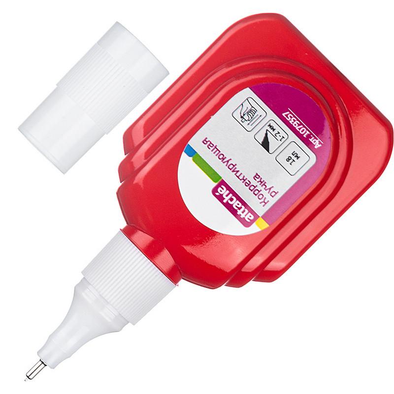 Корректирующая ручка Attache предназначена для точечных исправлений на любых типах бумаги. Данный вид корректировки особенно удобен, если Вам нужно исправить небольшой объем текста или даже самую маленькую помарку. Идеально подходит для студентов и старших школьников. Объем флакона - 18 мл. Металлический наконечник позволяет наносить тонкие линии. Содержит быстросохнущую основу, обладает высокой кроющей способностью. 1. Перед применением тщательно встряхните средство в течение не менее 10 секунд, затем снимите колпачок. 2. Прижмите наконечник ручки к поверхности бумаги. 3. Нажмите на корпус ручки для подачи корректирующего средства и равномерно нанесите его на бумагу. 4. После применения плотно закройте колпачок.