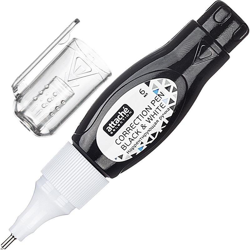 Корректирующая ручка Attache Selection Black&White предназначена для точечных исправлений на любых типах бумаги. Данный вид корректировки особенно удобен, если Вам нужно исправить небольшой объем текста или даже самую маленькую помарку. Идеально подходит для студентов и старших школьников. Объем флакона - 6 мл. Металлический наконечник позволяет наносить тонкие линии. Содержит быстросохнущую основу, обладает высокой кроющей способностью. 1. Перед применением тщательно встряхните средство в течение не менее 10 секунд, затем снимите колпачок.2. Прижмите наконечник ручки к поверхности бумаги.3. Нажмите на корпус ручки для подачи корректирующего средства и равномерно нанесите его на бумагу.4. После применения плотно закройте колпачок.