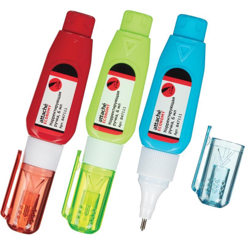 Корректирующий карандаш Attache Economy предназначен для точечных исправлений на любых типах бумаги. Данный вид корректировки особенно удобен, если Вам нужно исправить небольшой объем текста или даже самую маленькую помарку. Идеально подходит для студентов и старших школьников. Объем флакона - 6 мл. Металлический наконечник позволяет наносить тонкие линии. Содержит быстросохнущую основу, обладает высокой кроющей способностью.<br>1. Перед применением тщательно встряхните средство в течение не менее 10 секунд, затем снимите колпачок.<br>2. Прижмите наконечник ручки к поверхности бумаги.<br>3. Нажмите на корпус ручки для подачи корректирующего средства и равномерно нанесите его на бумагу.<br>4. После применения плотно закройте колпачок.<br>Внимание! Товар поставляется в нескольких вариантах цвета/дизайна корпуса (без возможности выбора).