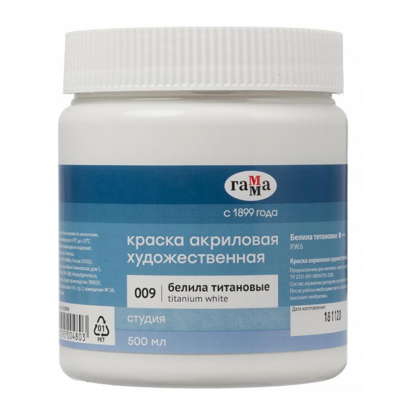 Краска акриловая Гамма Студия белила титановые 500 мл в пластиковой банке<br> <br> Акриловая краска Студия оттенка 009 (белила титановые) предназначена для художественной живописи и декоративно-прикладного творчества. Она обладает высокой укрывистостью, хорошей адгезией и прочностью. После высыхания приобретает глянцевый эффект и практически не темнеет, а специальные добавки позволяют максимально раскрыть чистоту и яркость белого цвета.<br> Благодаря густой консистенции и хорошей разносимости краска подходит для работы в различных техниках живописи. Время высыхания варьируется от 10 минут до 1 часа в зависимости от толщины слоя. Легко наносится на бумагу, картон, грунтованный холст, дерево, стекло, кожу и ткань. Увеличенный объем банки делает ее удобной для масштабных работ и продолжительного использования.