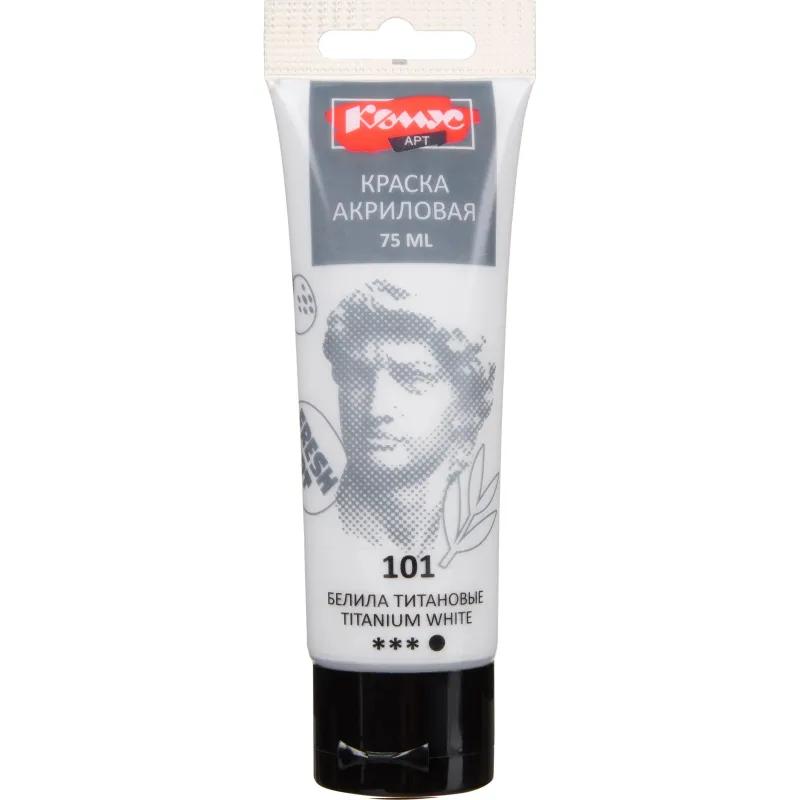 Краска акриловая Комус Арт белила титановые 75 мл в тубе<br /> <br /> Акриловая краска Комус Арт предназначена для художественных работ: она подходит как для профессионалов, так и для начинающих художников. Может использоваться на различных поверхностях — таких как бумага, картон, дерево или холст. Краска обладает отличной укрывистостью и хорошей адгезией. Она быстро сохнет и не желтеет со временем. Краска представлена в одном цвете — белом (101, титановые белила). Упаковка выполнена в форме тубы — оптимальная емкость для дозирования и хранения (поставляется без кисточки). Покупая белила Комус Арт, вы получаете высококачественный и удобный в использовании материал по доступной цене — для занятий живописью любого уровня.