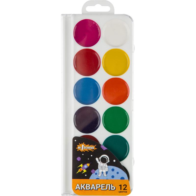 Краски акварельные медовые Комус Класс Space time 12 цветов<br><br>Акварельные медовые краски № 1 School Space time разработаны для детского творчества и отлично подойдут для занятий в школе, художественных кружках или дома. Дизайн упаковки с космической тематикой делает набор особенно интересным для мальчиков младшего и среднего возраста.<br><br>Краски обладают высокой цветовой насыщенностью, легко разносятся по бумаге, устойчивы к свету и хорошо смешиваются между собой. В составе — тонкодисперсная суспензия пигментов и наполнителей в водорастворимом связующем с модифицирующими добавками. Продукт безопасен для детей, не содержит токсичных веществ, легко смывается с кожи и отстирывается с одежды.<br><br>Набор включает 12 полусухих красок. Кисточка в комплект не входит.<br><br>Краски размещены в пластиковой подложке с европодвесом. Размер упаковки — 200×75×15 мм.