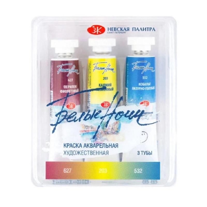 Краски акварельные Белые ночи Ботаника набор 3 цвета по 10 мл в тубах<br><br>Акварельные краски Белые Ночи предназначены для художников, создающих живописные работы. Эти краски подходят как для студийной работы, так и для пленэров. В состав входят тонкотёртые пигменты и натуральный гуммиарабик. Краски обладают высокой концентрацией пигмента и интенсивностью цвета.<br><br>Набор включает три цвета в тубах по 10 мл: перилен фиолетовый, кадмий лимонный, кобальт лазурно-голубой. Тубы упакованы в коррекс. Продукт обеспечивает стабильность цвета и простоту использования.<br><br>Краски легко смешиваются и размываются. Они сохраняют насыщенность даже при значительном разбавлении водой. Продукт удобен для переноса благодаря компактному коррексу. Подходит для профессионалов и любителей. Высокая концентрация пигментов обеспечивает яркость и стабильность оттенков.
