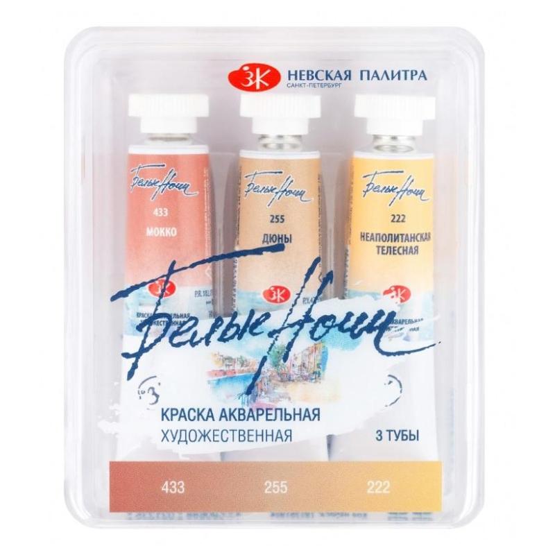 Краски акварельные Белые ночи Кожа набор 3 цвета по 10 мл в тубах<br><br>Акварельные краски Белые Ночи предназначены для художников, создающих работы с акцентом на натуральные оттенки кожи. Эти краски подходят как для студийной работы, так и для пленэров. В состав входят тонкотёртые пигменты и натуральный гуммиарабик. Краски обладают высокой концентрацией пигмента и интенсивностью цвета.<br><br>Набор включает три цвета в тубах по 10 мл: мокко, дюны, неаполитанская телесная. Тубы упакованы в коррекс. Продукт обеспечивает стабильность цвета и простоту использования.<br><br>Краски легко смешиваются и размываются. Они сохраняют насыщенность даже при значительном разбавлении водой. Этот набор идеален для создания портретов и изображений человеческой кожи благодаря выбранным оттенкам. <br><br>Продукт удобен для переноса благодаря компактному коррексу. Подходит для профессионалов и любителей. Высокая концентрация пигментов обеспечивает яркость и стабильность оттенков.